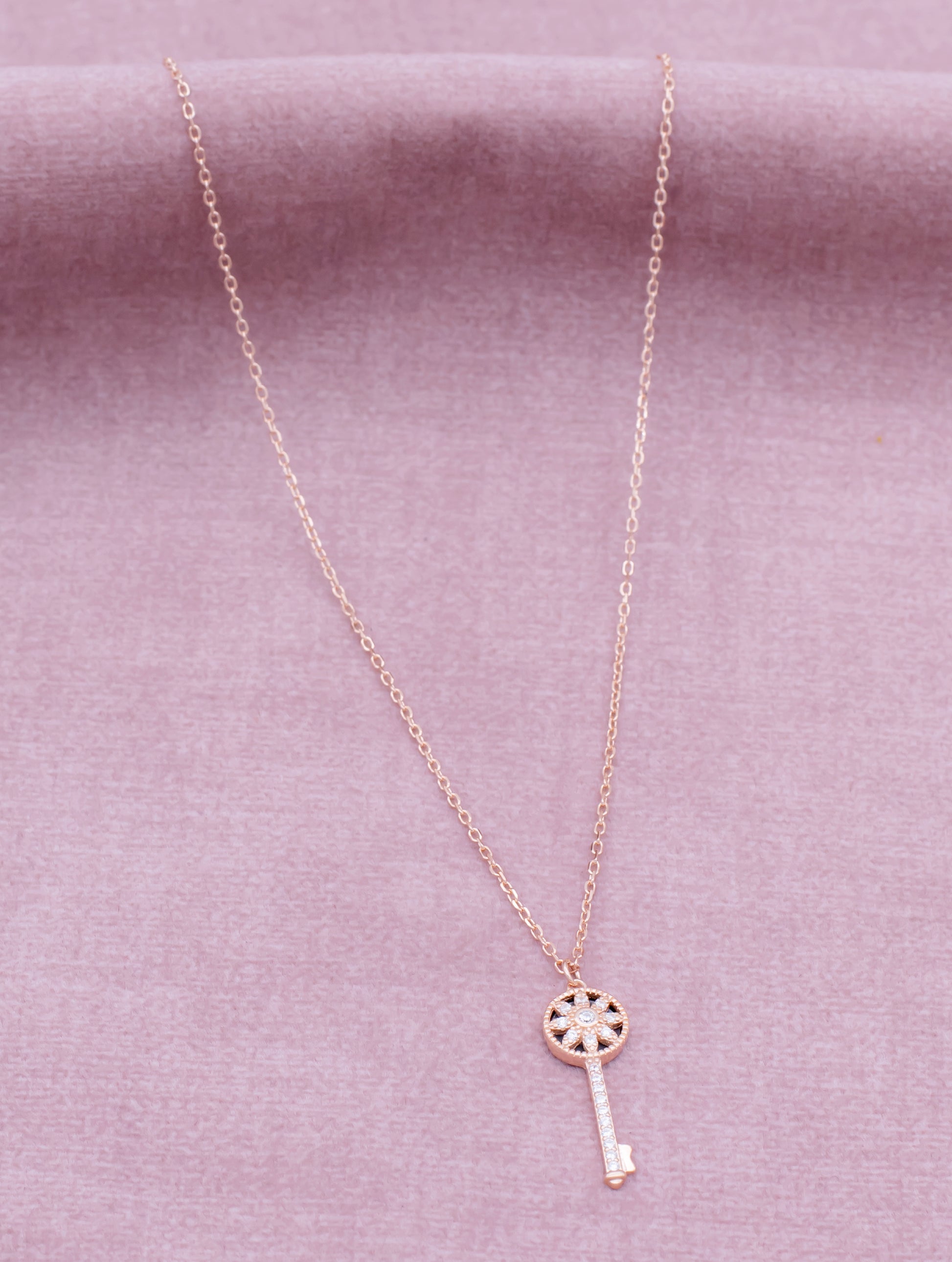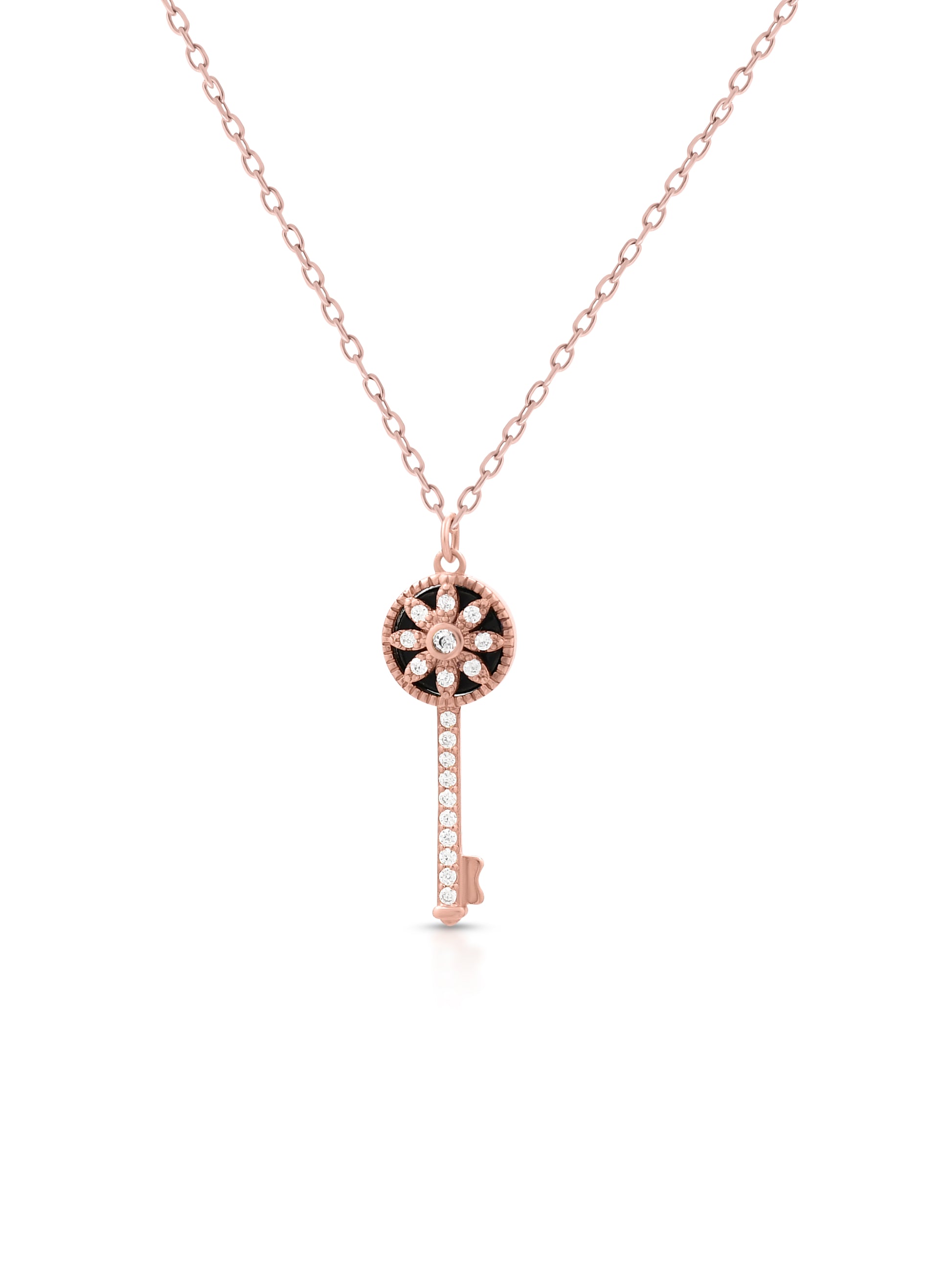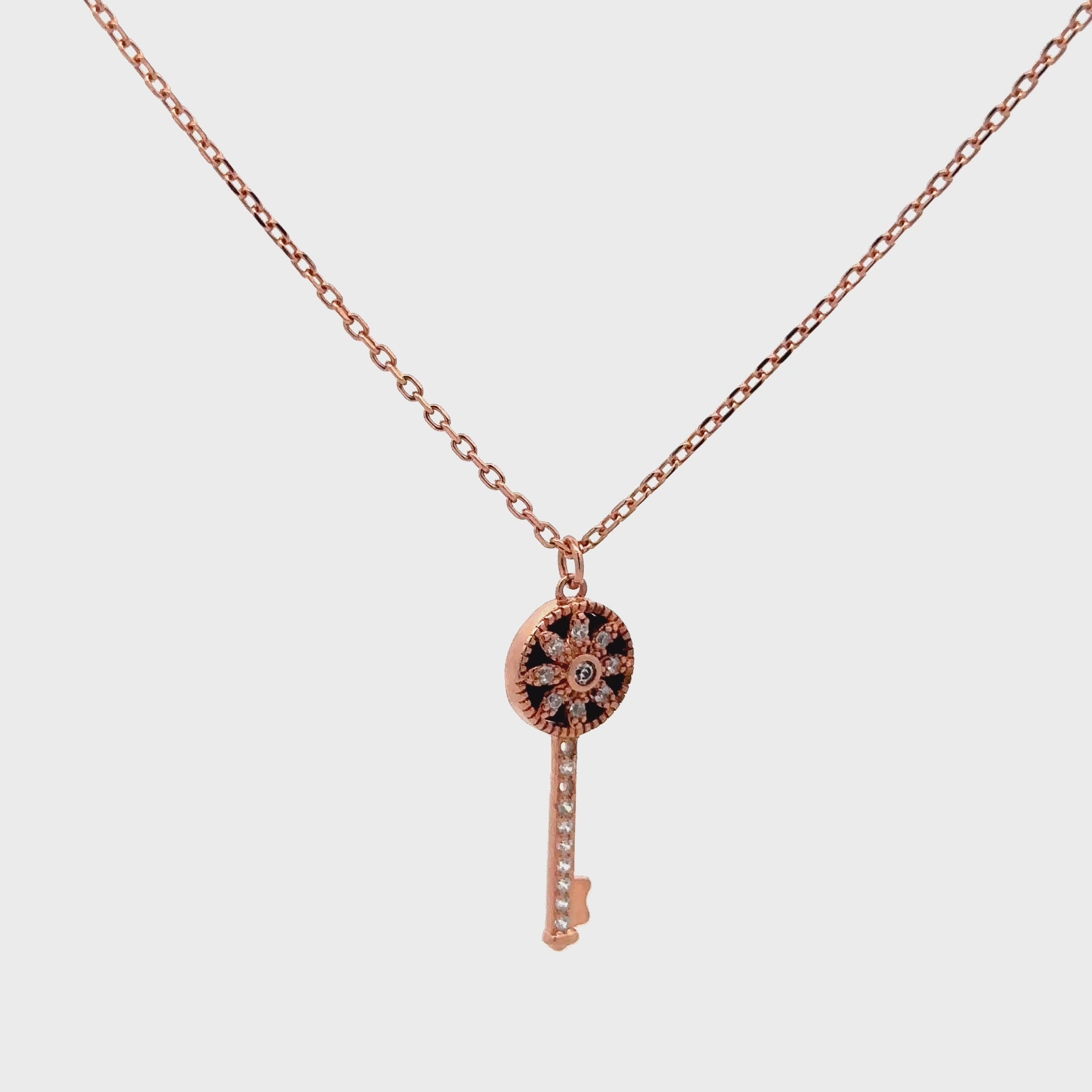 Introducing our rose gold silver chain adorned with a key-shaped pendant featuring blue enameling and white Swarovski zircon. This design harmoniously blends the warmth of rose gold with the vibrant hue of black enameling and the sparkling allure of Swarovski crystals. The result is a stylish and eye-catching accessory that exudes sophistication and adds a touch of elegance to any ensemble.