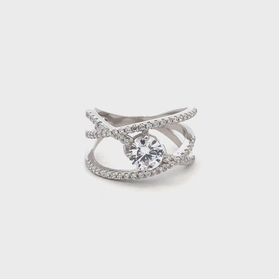 Introducing our stylish ring adorned with shimmering silver Swarovski zircon and a captivating solitaire at its center. This ring boasts a unique design with three layers that intertwine from the sides, culminating at the solitaire for an eye-catching effect.
