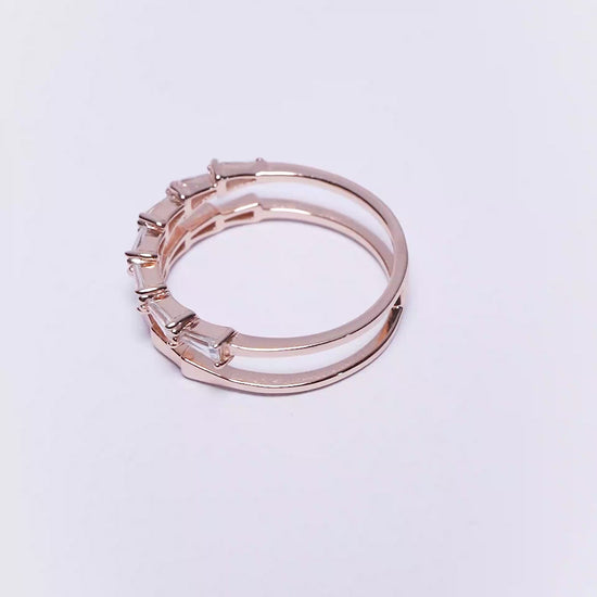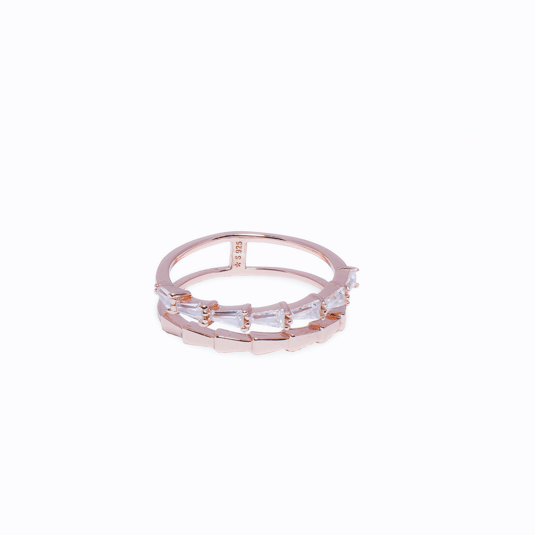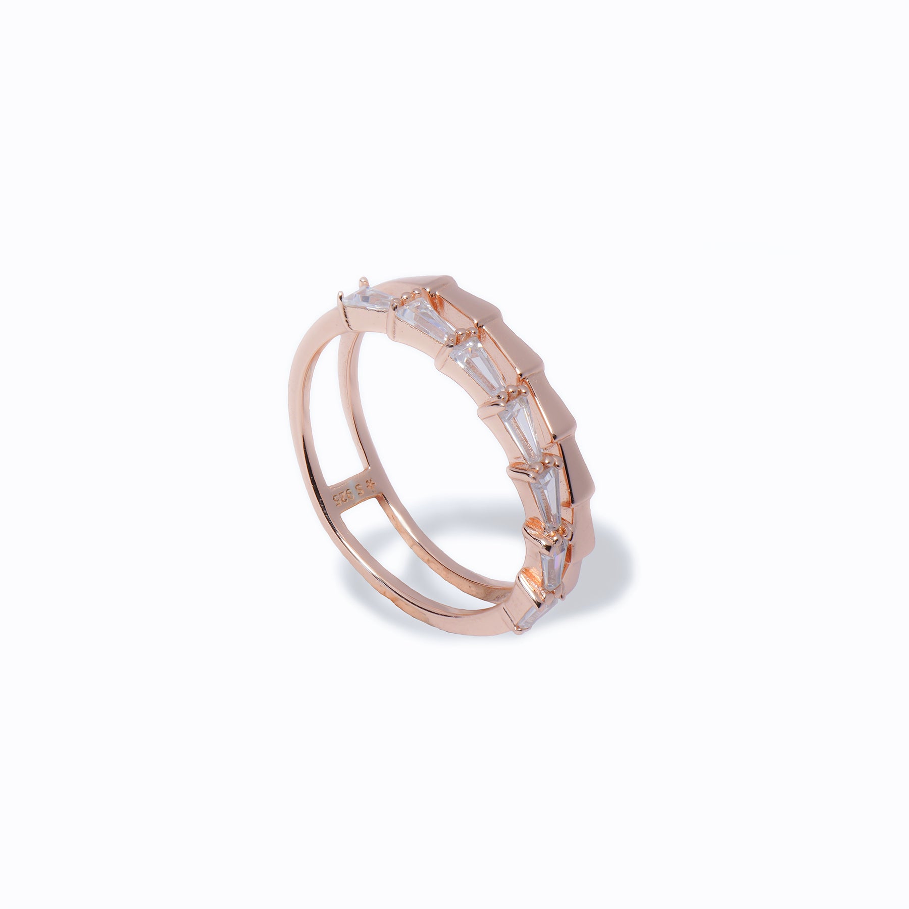 This sophisticated ring finished with rose gold polish, features a modern design of two parallel lines. The sleek parallel design is adorned with dazzling baguette stones, adding a touch of elegance and sparkle. The rose gold polish offers warm, inviting glow. This unique combination of design elements make the ring a stylish and refined accessory, perfect for both everyday wear and special occasion.
