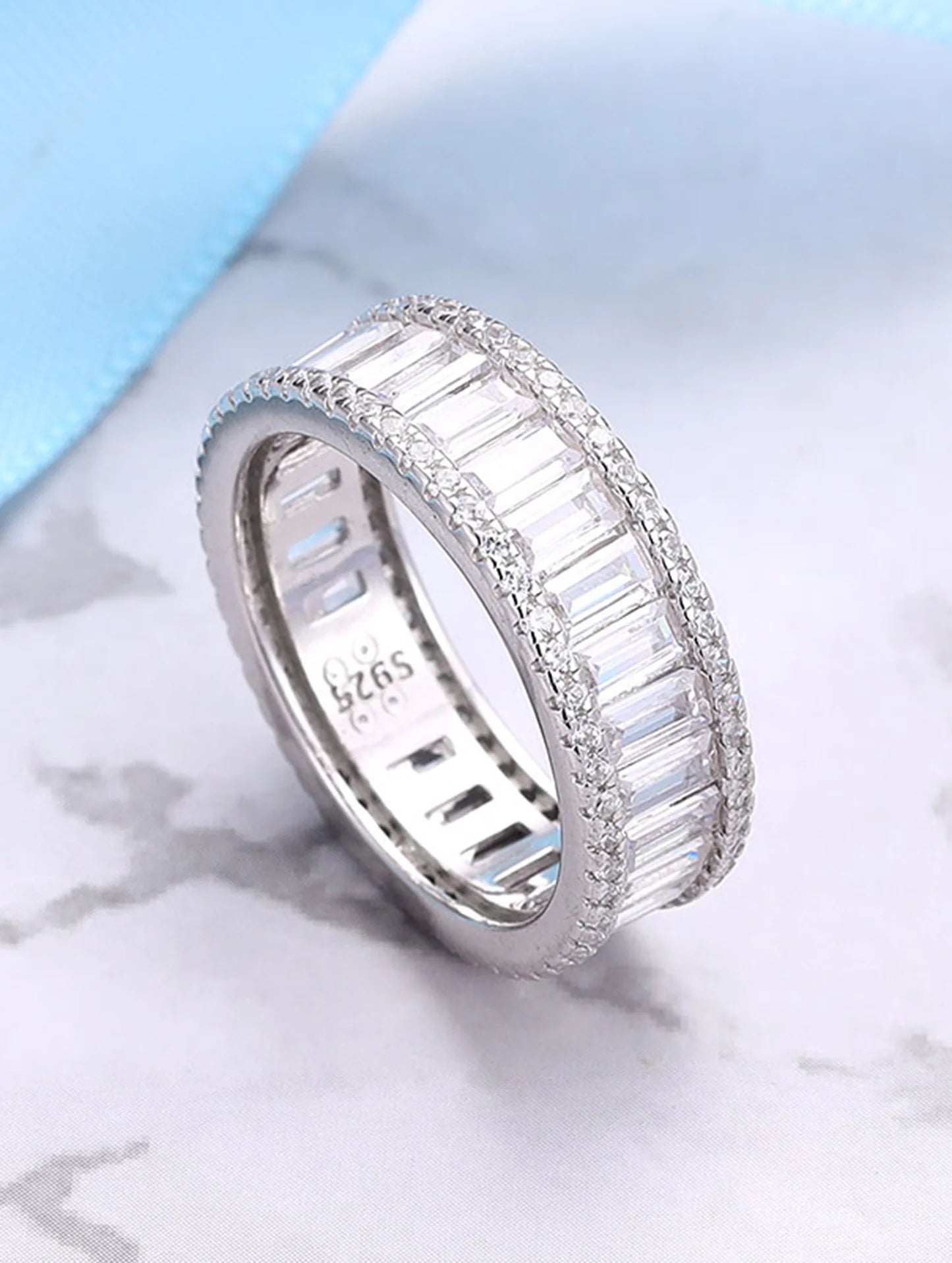 Sleek, sparkling, and effortlessly elegant — this sterling silver tennis band ring is a timeless classic. Crafted from high-quality 925 sterling silver, the band is adorned with a continuous row of brilliant-cut stones, offering a radiant, uniform shine from every angle.